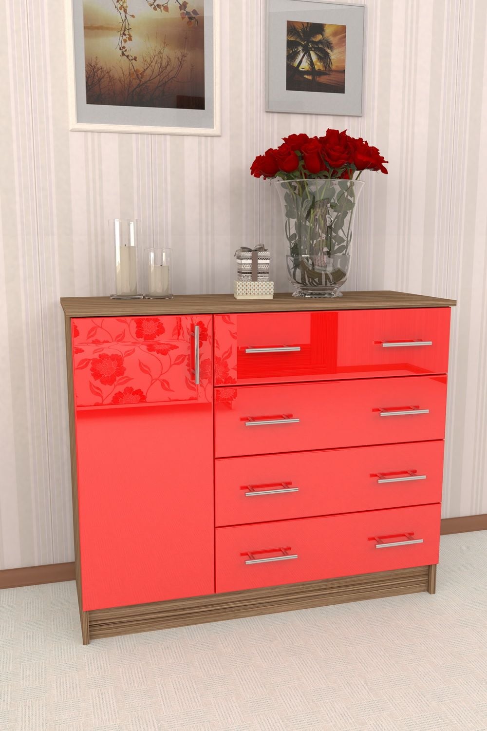 Мебель оснащается выдвижными ящиками, распашными или откидными дверцами. Комод является незаменимым предметом современного интерьера, дополняет оформление комнаты и не мешает, занимая мало места.